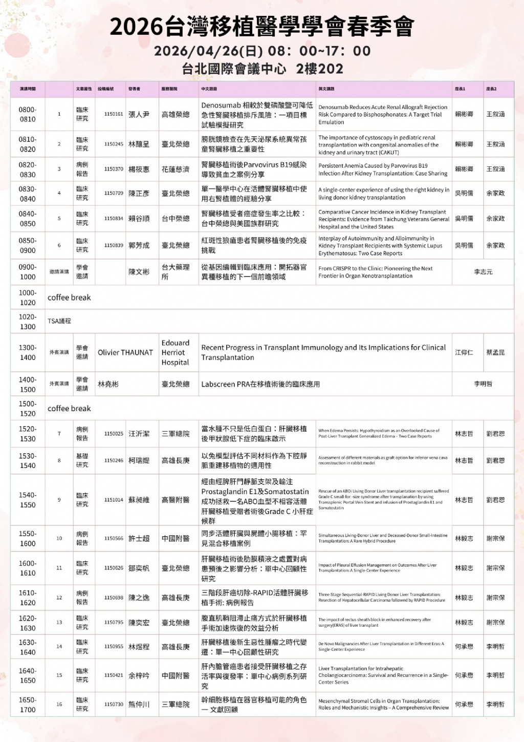 【課程訊息公告】2026移植春季會議程